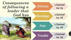 14:24 掃羅叫百姓起誓說,凡不等到晚上向敵人報完了仇吃甚麼的,必受咒詛。因此這日百姓沒有吃甚麼,就極其困憊。